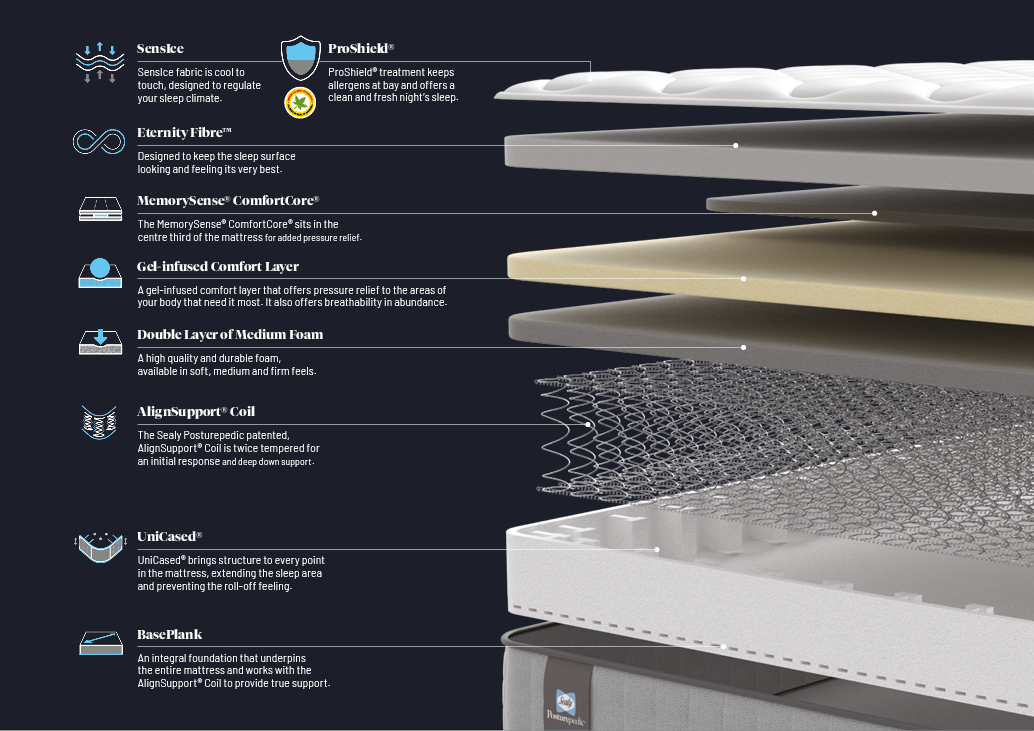 The MemorySense® ComfortCore®, placed in the centre third of the mattress, provides the ultimate pressure relief to the heaviest parts of your body such as your hips and lower back. Together with the gel-infused comfort layer, it offers pressure relief to the areas of your body that need it most. The Geltex layer has an open cell structure, allowing air to circulate through the mattress easily and regulating your temperature as you sleep. Topped with a double layer of Sealy Medium foam for a sumptuous feel.