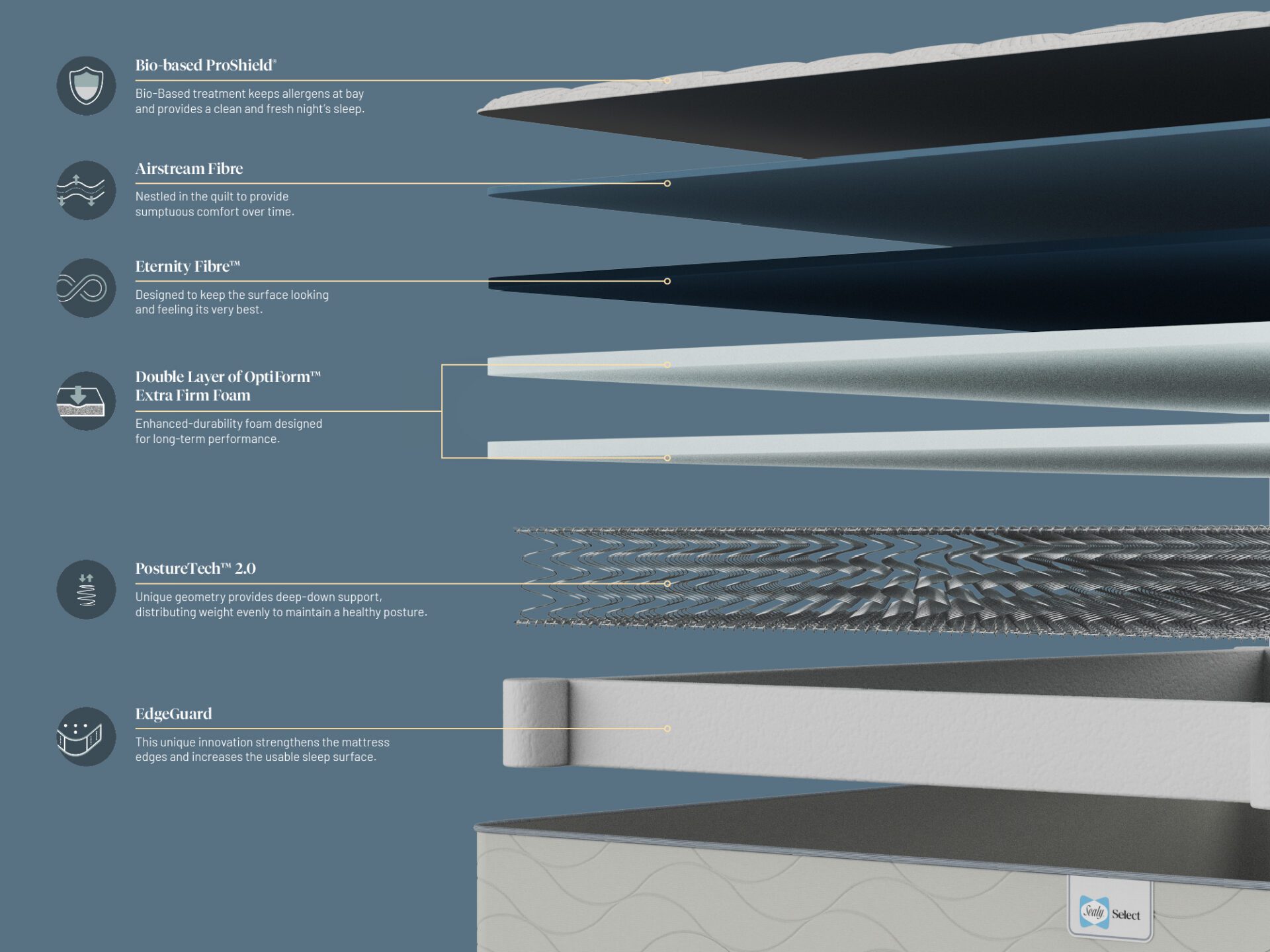 At its core is PostureTech™ 2.0, Sealy’s new smart spring technology. This is no ordinary spring. The unique geometry of the PostureTech™ 2.0 spring responds to your individual body shape to provide deep-down support. Delivering consistent support right across the sleep surface, it is designed to distribute weight evenly and help maintain a natural shape and healthy posture. PostureTech™ 2.0 uses a higher gauge wire for greater stability and performance resilience over time. Twice tempered and rigorously tested by Sealy Scientists, it delivers enduring quality making lumpy and uneven mattresses a thing of the past.