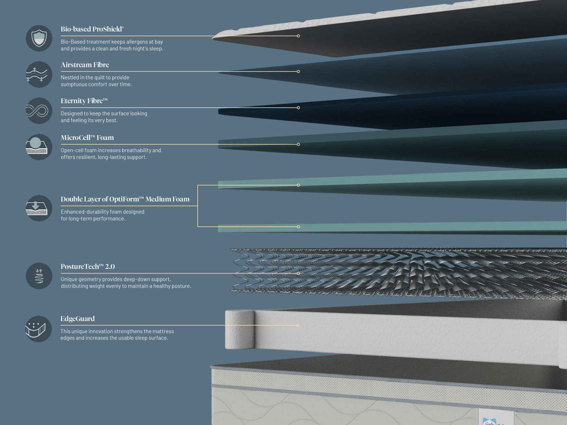 Enhancing the support system is the intelligent comfort architecture. MicroCell™ foam is both durable and resilient, offering a soft, sumptuous feel with an open‑cell structure that enhances breathability this works alongside a double layer of OptiForm™ medium foam to gently cushion and adapt to your body. The result is a perfectly balanced feel that delivers support without compromising on resilience.